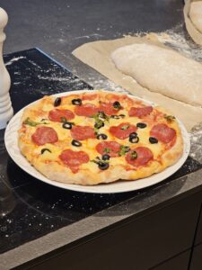 Når pizzaen er ferdig, er det bare å få den over på den varme flaten inne i ovnen. Steketid er alt fra 3-15 minutter, her må du følge med =)